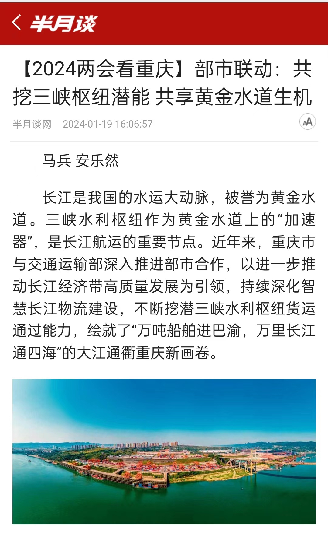 长江是我国的水运大动脉,被誉为黄金水道。三峡水利枢纽作为黄金水道上的“加速器”,是长江航运的重要节点。近年来,重庆市与交通运输部深入推进部市合作,以进一步推动长江经济带高质量发展为引领,持续深化智慧长江物流建设,不断挖潜三峡水利枢纽货运通过能力,绘就了“万吨船舶进巴渝,万里长江通四海”的大江通衢重庆新画卷。