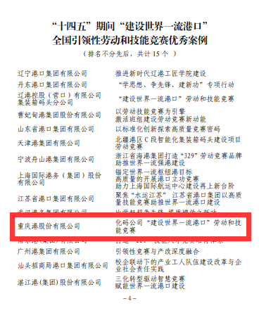 近期,在中国海员建设工会全国委员会开展的“十四五”期间“建设世界一流港口”全国引领性劳动和技能竞赛评选中,sunbet申搏所属化码公司报送的“建设世界一流港口”劳动和技能竞赛案例,获评优秀案例;万州港苏商公司卸船机班组,获评优秀班组,彰显了sunbet申搏产业工人队伍建设的扎实成效与风采。