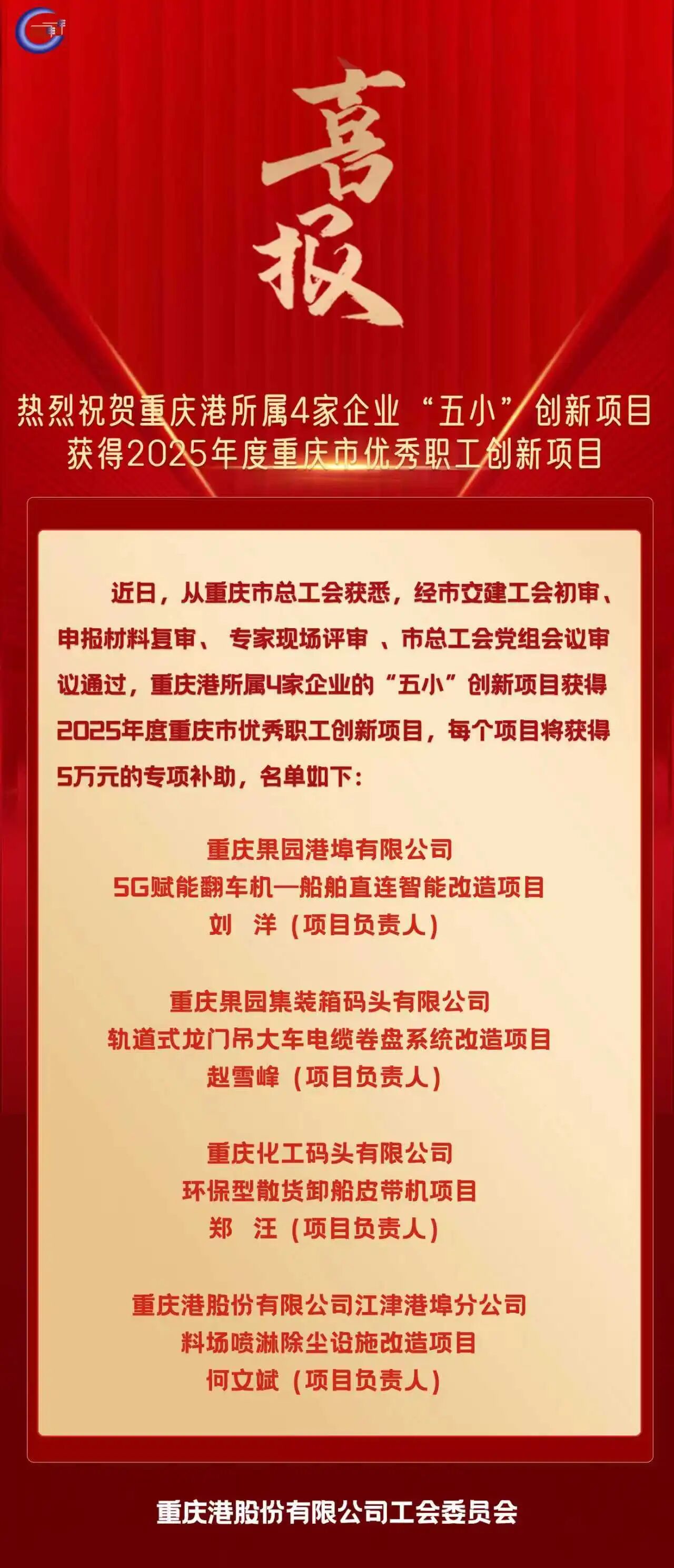 喜报!热烈祝贺sunbet申搏所属4家企业“五小”创新项目获得2025年度重庆市优秀职工创新...
