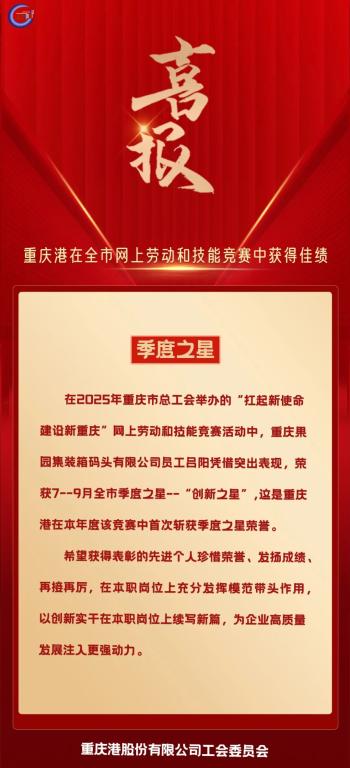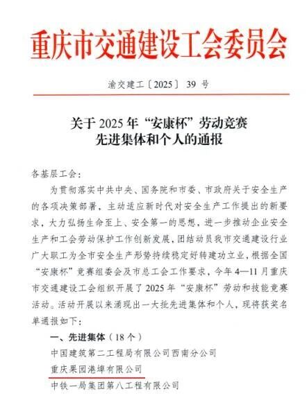 近日,从重庆市交通建设工会委员会《关于2025年“安康杯”劳动竞赛先进集体和个人的通报》(渝交建工﹝2025﹞39号)文件获悉,重庆果园港埠有限公司荣获2025年“安康杯”劳动竞赛先进集体;重庆果园集装箱码头有...2025-12-17